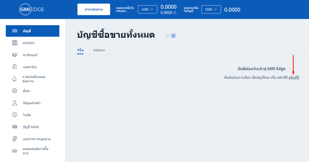 จากนั้นท่านจะพบกับหน้าพื้นที่สมาชิกของท่าน โดยหน้านี้จะบอกรายละเอียดทุกอย่างเกี่ยวกับบัญชี GMIEDGE ของท่าน ให้ท่านคลิก เปิดบัญชีใหม่ เพื่อทำการสร้างบัญชีซื้อขายใหม่