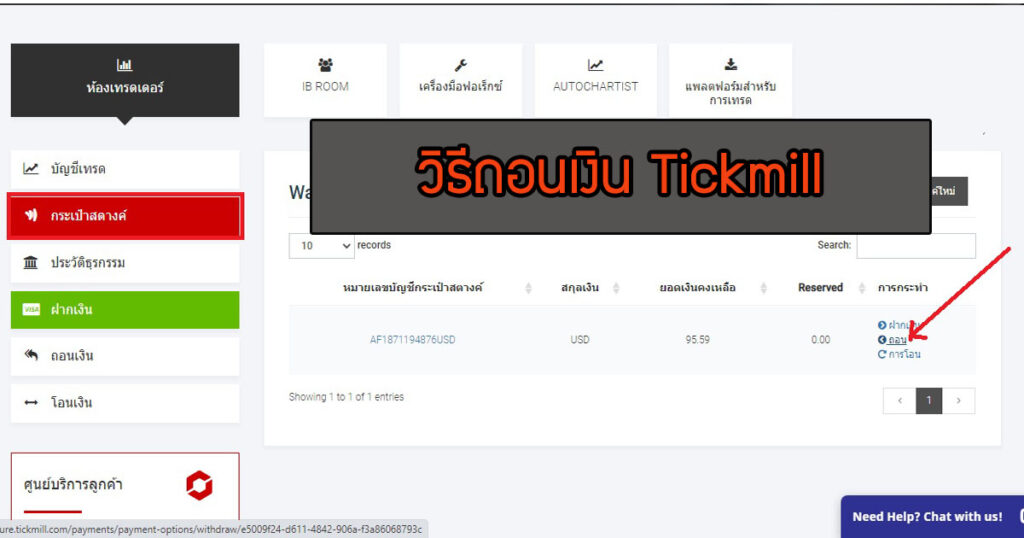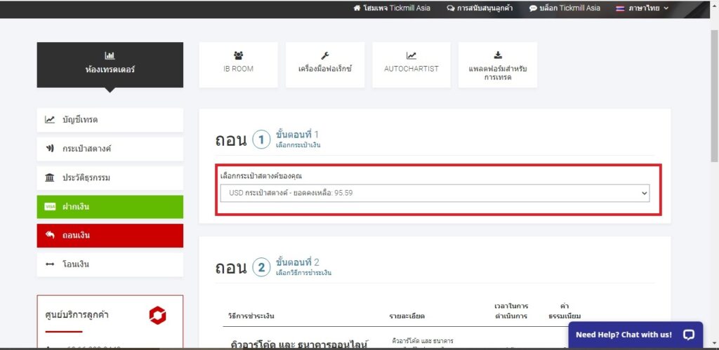 การถอนเงินจากโบรกเกอร์ Tickmill จะแตกต่างจากโบรอกเกอร์อื่นตรงที่เราจะถอนเงินออกได้จะต้องมีเงินในกระเป่ษสตางค์ก่อน เพราะฉนั้นต้องทำการโอนเงินจากบัญชีเทรดเข้ากระเป๋าสตางค์ก่อน แล้วจึงทำการถอนเงินได้ ซึ่งมีขั้นตอนง่ายๆดังนี้